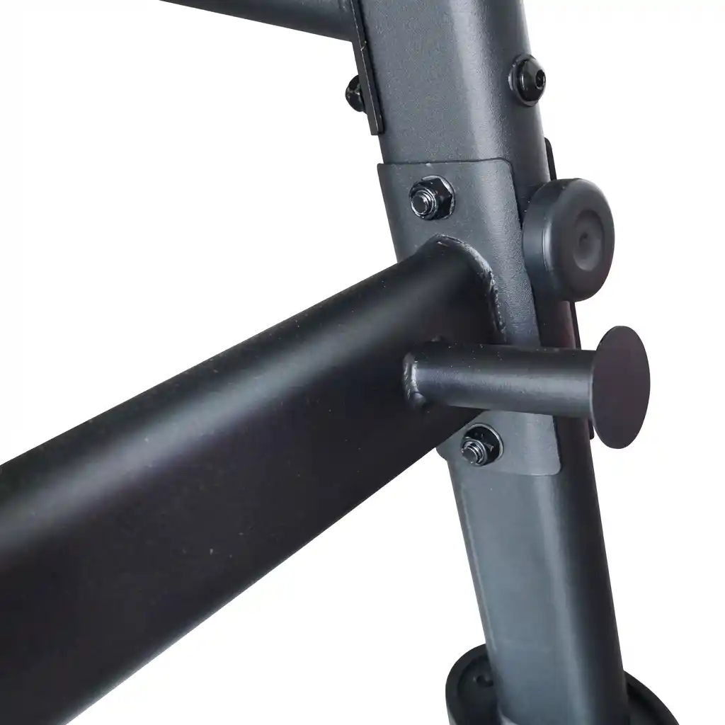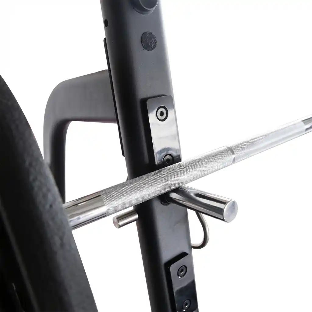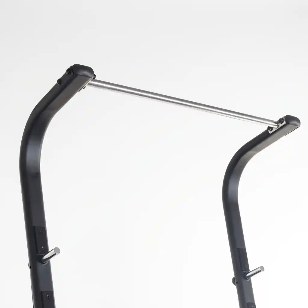The top connecting bar functions as a pull-up station. It is high enough (2080mm) to allow for full hanging extension. This transforms the rack into a complete upper-body developer, supporting pull-ups, chin-ups, and hanging leg raises (or attachment of suspension trainers).