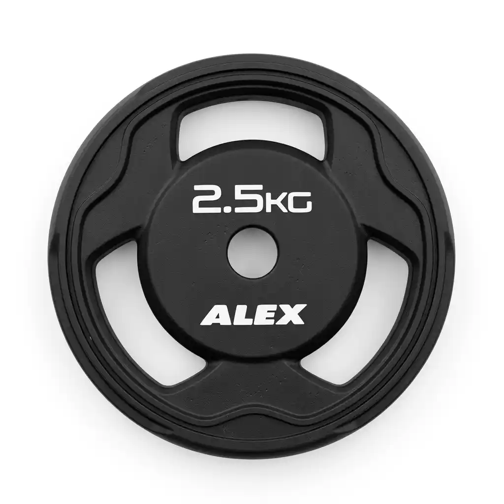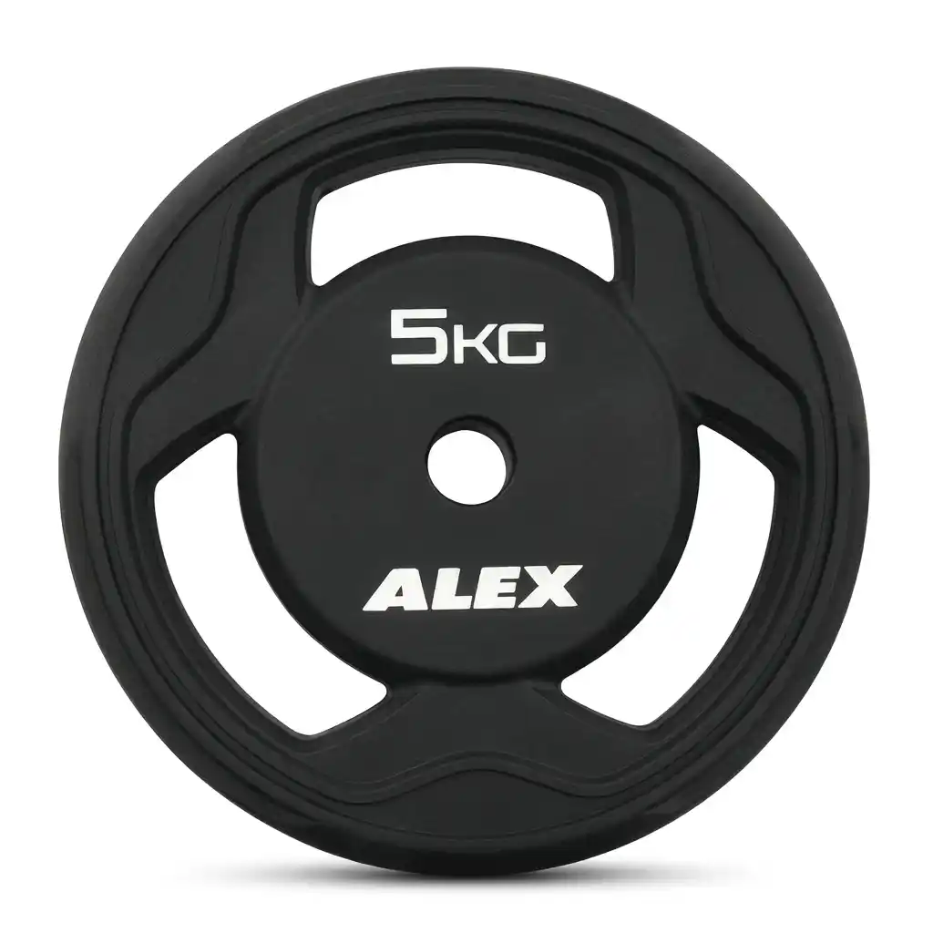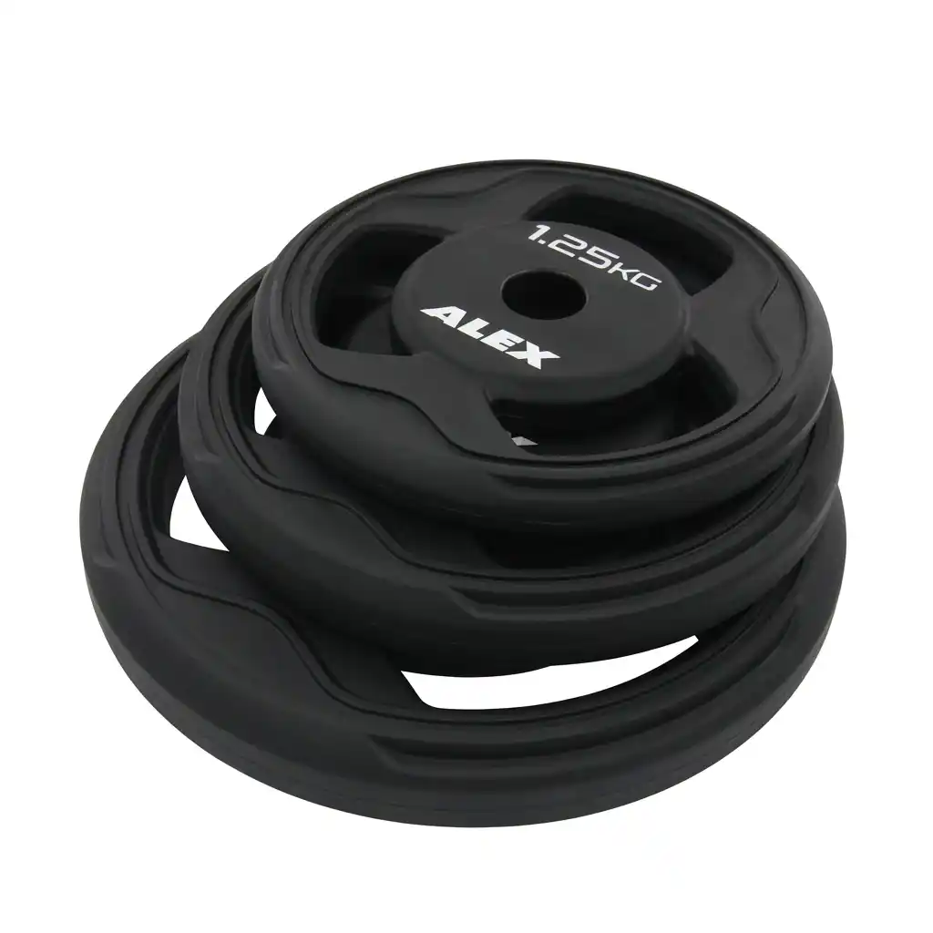 In the high-energy world of group fitness classes, equipment needs to be safe, fast to handle, and durable. The Pump Plate (Tri-Spoke S1) by Alex Athletics is designed specifically for this studio environment. Unlike standard iron plates, these discs are coated in high-density rubber. This coating serves two critical purposes: it protects the studio floor from damage during quick changes, and it deadens the noise of plates clanking together, allowing the instructor’s voice and music to take center stage. The center hole is sized at 28mm (Standard), making it compatible with the lightweight pump bars used in aerobic strength classes.