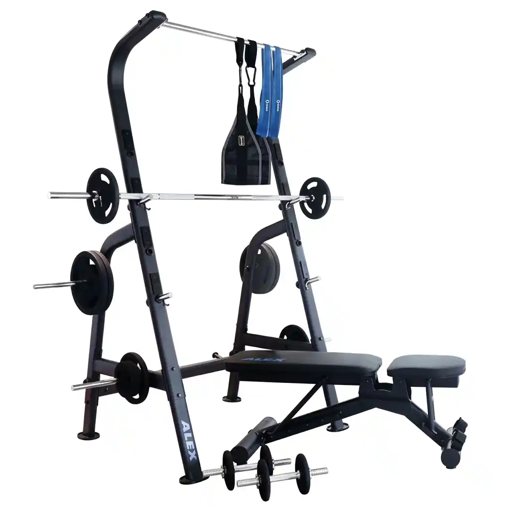 The T-Fit Home Fitness Kit by Alex Athletics is the ultimate all-in-one solution for transforming any space into a professional-grade private gym. Designed for those who value privacy, flexibility, and consistency, this comprehensive kit replicates the commercial gym experience at home. It includes a heavy-duty Multi-function Squat Rack, a versatile F.I.D. Bench, a 28mm Standard Barbell, Dumbbell Bars, and 80kg of weights, along with essential accessories like Power Bands and Ab Slings. Built with 14-gauge steel and featuring 8mm safety hooks, it prioritizes safety without compromising on performance. Whether you are a beginner looking to start your journey or a seasoned lifter needing 24/7 access to iron, the T-Fit Home Fitness Kit offers the durability and versatility required to shape your life and physique on your own terms.